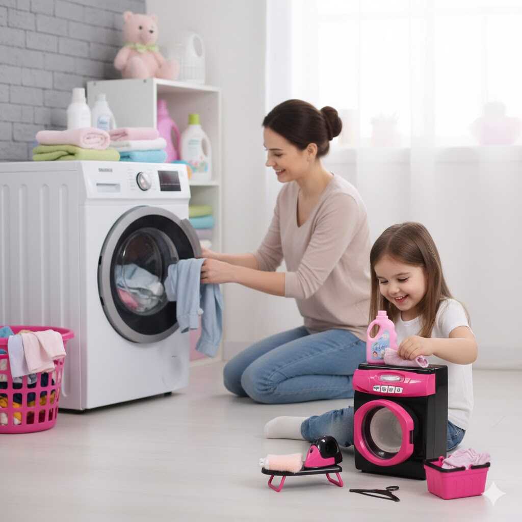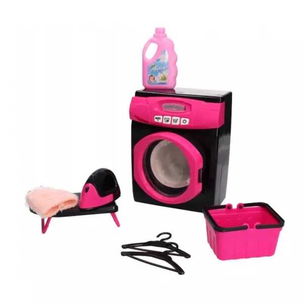 A készlet minden olyan eszközt tartalmaz, amelyre egy kis háziasszonynak vagy házvezetőnek szüksége lehet a tiszta ruhákhoz. A szett része egy élethű mosógép, egy vasalódeszka az elegáns megjelenésért, valamint praktikus vállfák és egy szennyestartó kosár a rendszerezéshez. A csomagban található játék mosószeres flakon teszi még hitelesebbé az élményt.