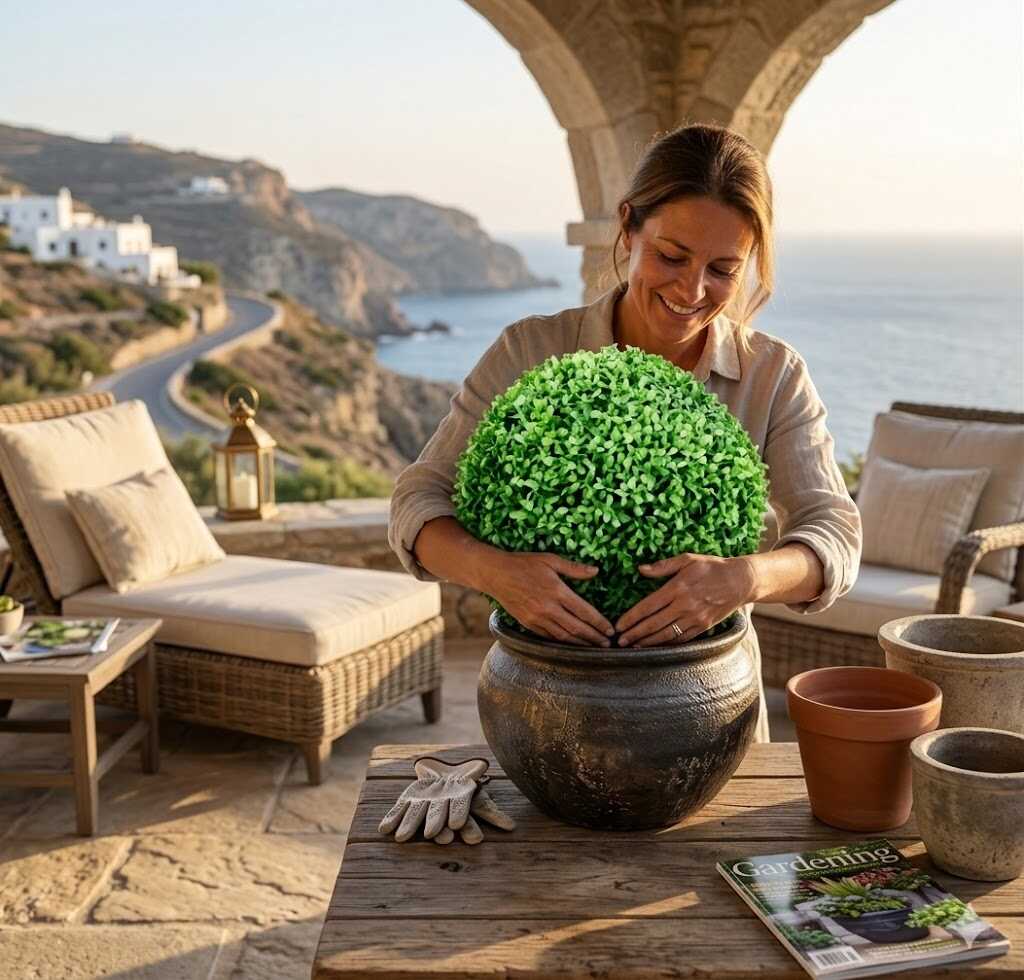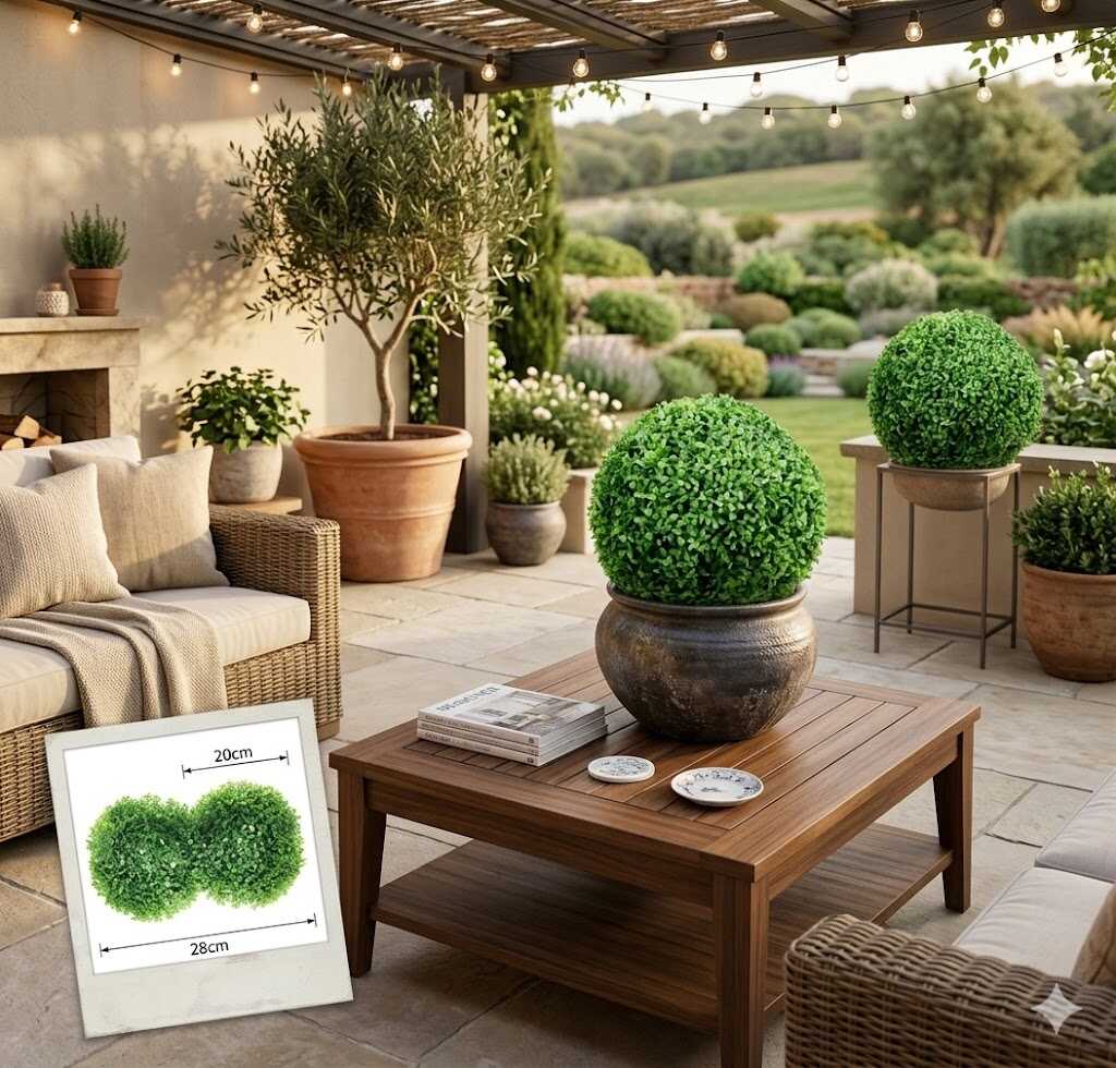 Varászoljon stílusos és rendezett megjelenést kertjébe, teraszára vagy beltéri helyiségeibe ezzel az élethű műnövény gömbbel. Ez a dekorációs elem tökéletes megoldás kaspókba helyezve bejáratok díszítésére, de akár függesztve is látványos kiegészítője lehet a modern tereknek. A sűrű, apró levelek a természetes puszpáng (boxwood) hatását keltik, miközben nem igényelnek metszést, öntözést vagy speciális fényviszonyokat.