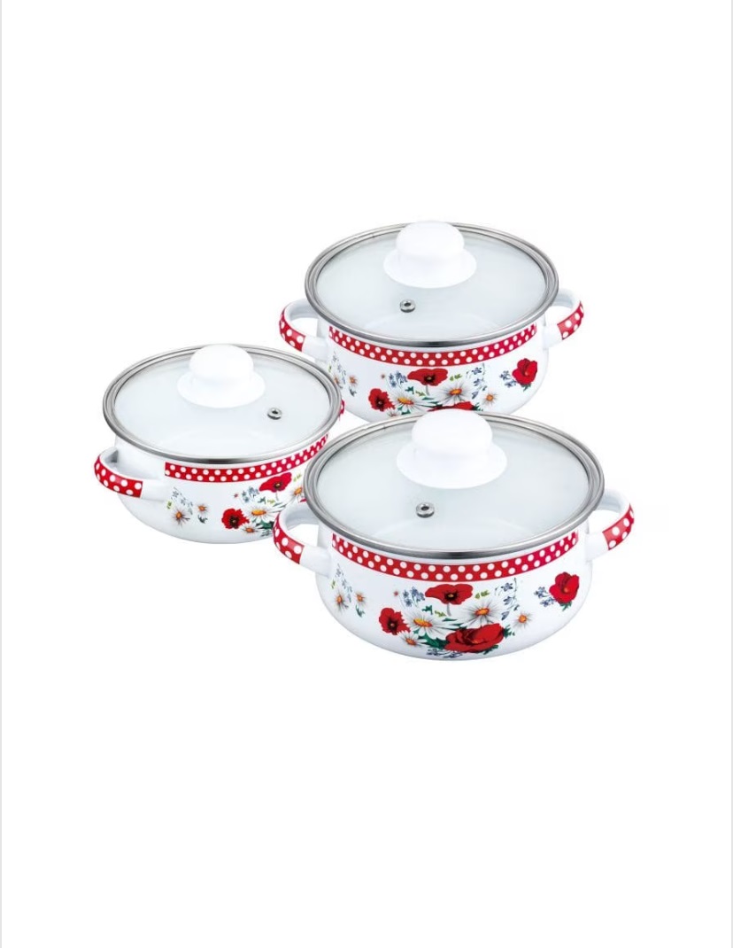 Kiváló minőségű anyagok: A készlet zománcozott acélból készült, amely tartós és könnyen tisztítható anyag. A fedelek edzett üvegből készültek, ami kiválóan ellenáll a hőnek és a kopásnak.