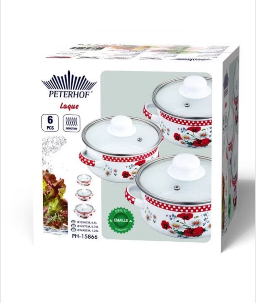 Összességében a Peterhof PH-15866 edénykészlet egy kiváló választás lehet otthoni konyhájához. A készlet tartós és praktikus, megfelelő méretű fazekakat kínálva minden főzési feladathoz. A gőz nyílással ellátott üveg fedelek lehetővé teszik a hatékony főzést, miközben a zománcozott acél anyag biztosítja a hosszú élettartamot és a könnyű tisztíthatóságot.