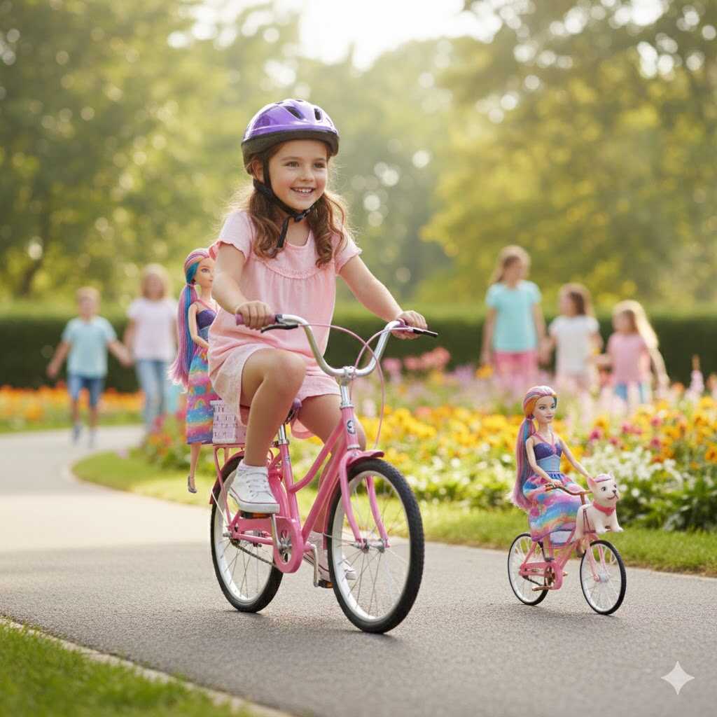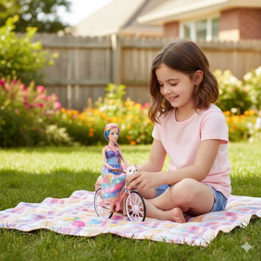 A szett legkülönlegesebb eleme maga a baba, akinek hosszú, szivárvány színeiben tündöklő haja és csillogó kék ruhája azonnal magára vonzza a tekintetet. A baba nem egyedül indul útnak: hűséges fehér kiskutyája kényelmesen pihen a kerékpár elején található virágos kosárban, készen a közös gurulásra.