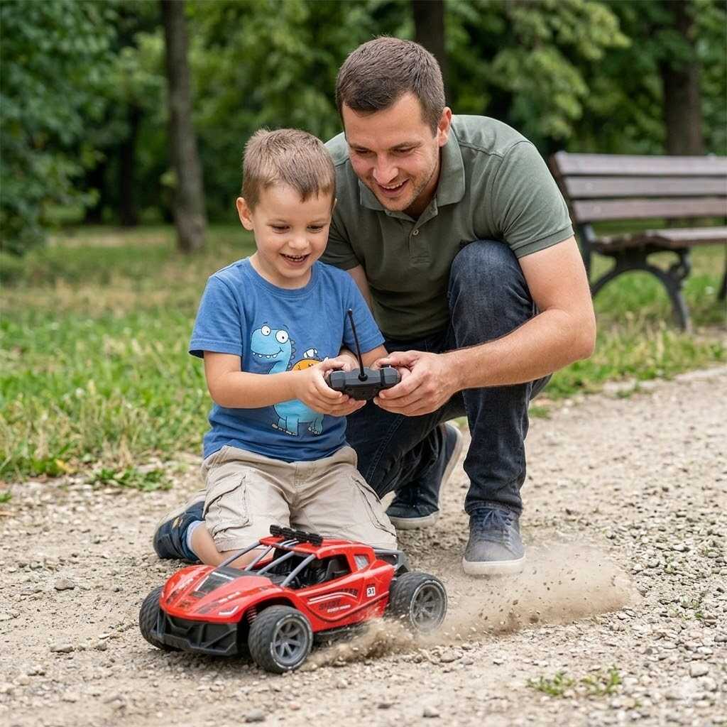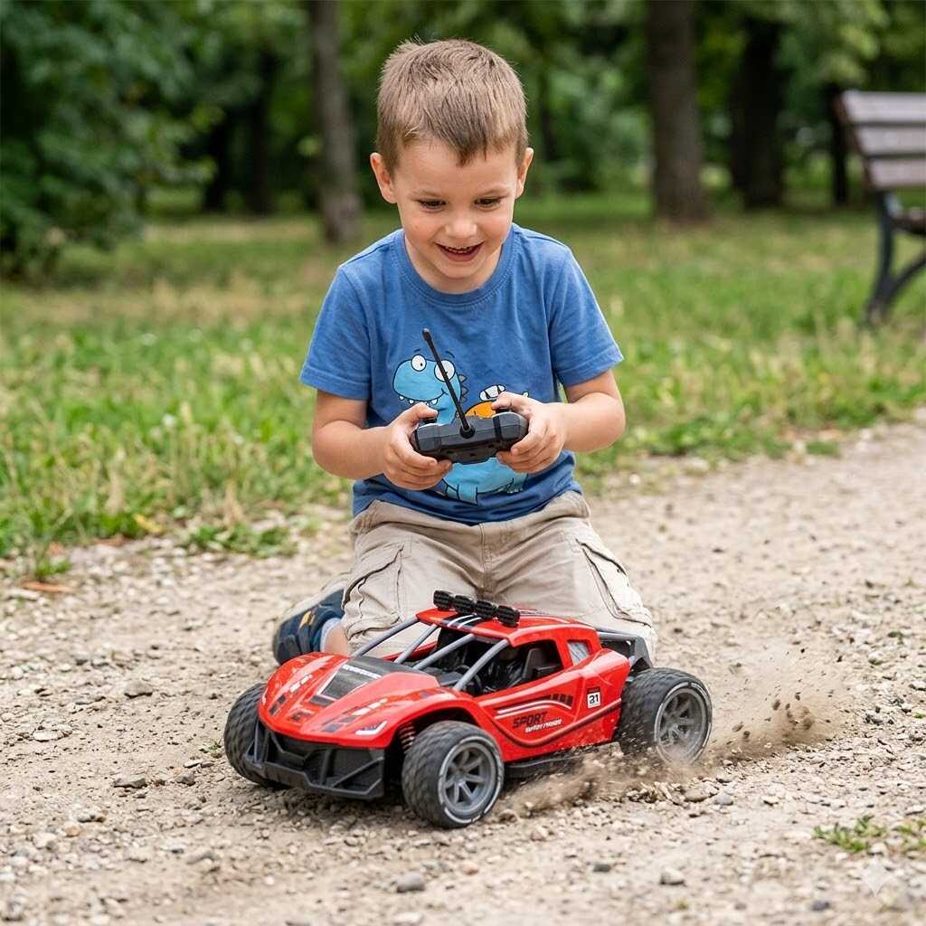 Ez a modern, áramvonalas távirányítós autó a sebesség és a technológia tökéletes ötvözete. A piros és fekete színekben pompázó sportkocsi nemcsak látványos, hanem masszív bukócsöves kialakításának köszönhetően a dinamikusabb futamokat is remekül bírja. Az 1:16-os méretarányú modell élethű részleteivel minden kis versenyzőt azonnal levesz a lábáról.