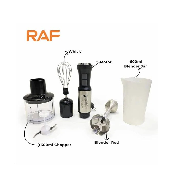 * 1 db RAF R.3028 motoros egység, 1 db botmixer szár, 1 db habverő, 1 db aprító tartály pengével, 1 db 1000 ml-es mérőpohár.