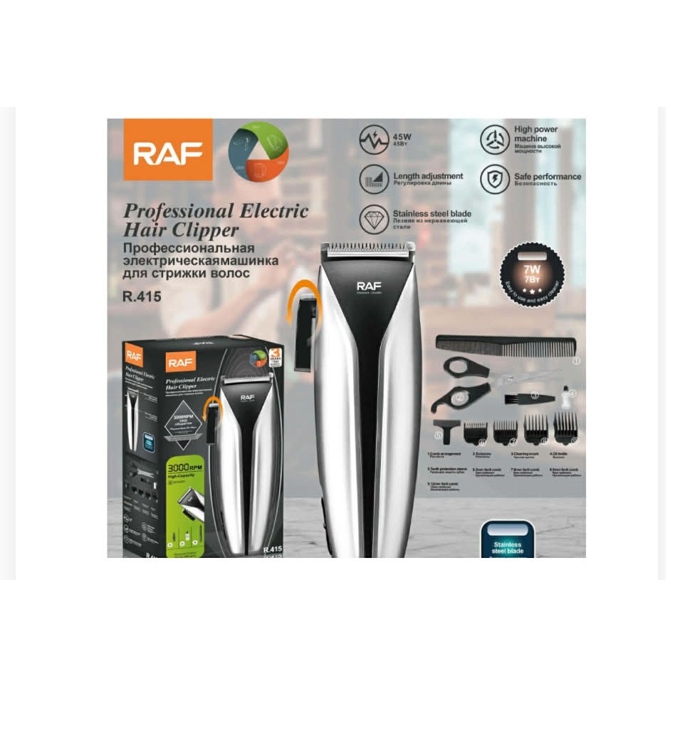 * 1 db RAF R.415 hajvágó gép, 4 db különböző méretű felhelyezhető fésű, 1 db fodrász olló, 1 db fésű, tisztító kefe és olaj.