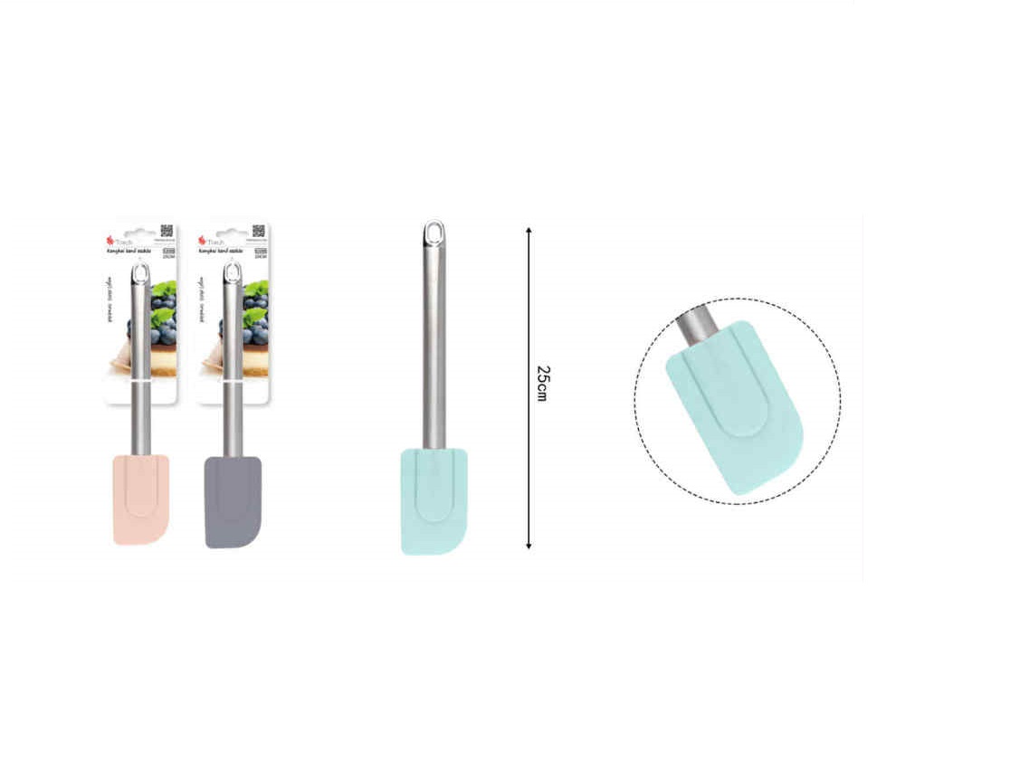 Modern és tartós konyhai eszköz, amely a rozsdamentes acél erejét ötvözi a szilikon rugalmasságával. Ez a 25 cm-es spatula tökéletes választás krémek simításához, tészták keveréséhez vagy az edények falára tapadt alapanyagok maradéktalan eltávolításához. A fém nyél stabil és professzionális fogást biztosít, miközben ellenáll a konyhai igénybevételnek.