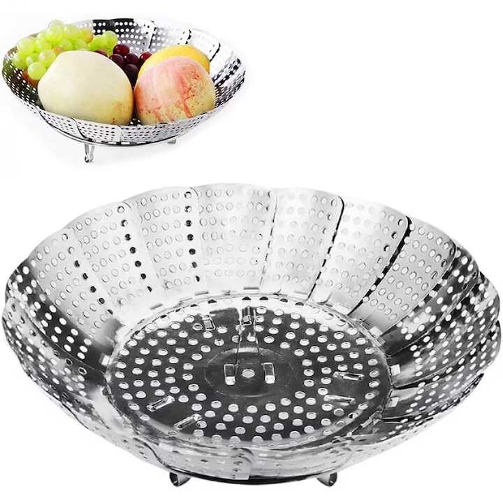 Ez a praktikus konyhai kiegészítő különleges, lamellás szerkezetének köszönhetően rugalmasan alkalmazkodik a különböző méretű edényekhez, így szinte bármelyik lábasát gőzölő edénnyé alakíthatja. A stabil lábak megemelik a betétet, biztosítva, hogy az étel ne érintkezzen a vízzel, csak a forró gőzzel. Használat után a betét egyszerűen összecsukható, így rendkívül helytakarékos megoldást nyújt bármely konyhában.