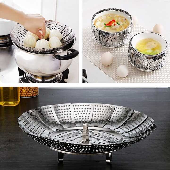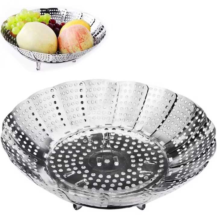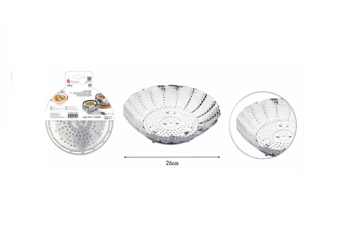 Ez a „virág” formájú, nyitható szerkezet intelligens módon alkalmazkodik a konyhájában már meglévő edények méretéhez. Legyen szó egy kisebb lábasról vagy egy nagyobb fazékról, a betét stabilan tartja az ételt a vízszint felett, biztosítva az egyenletes gőzölést. Használat után a lamellák egyszerűen egymásra csukhatók, így a tárolása alig igényel helyet.