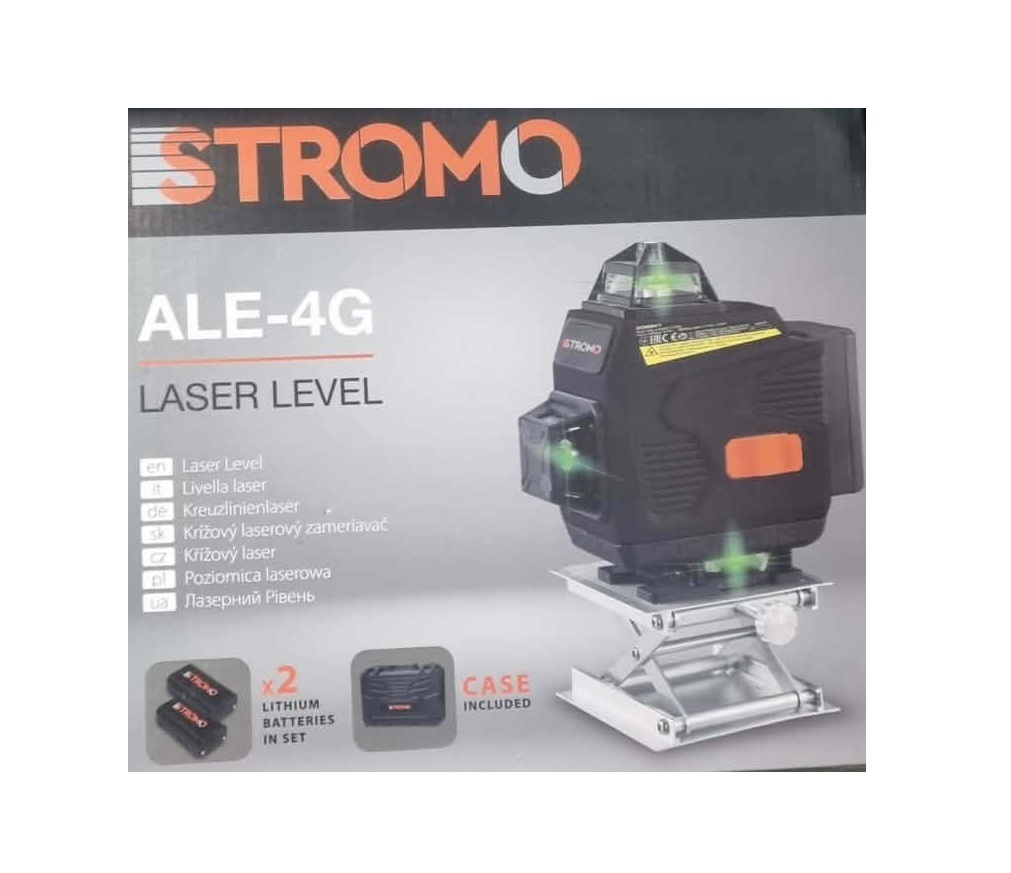 1 db STROMO ALE-4G lézeres szintező, 2 db Li-ion akkumulátor, 1 db emelőtalp, 1 db töltő és 1 db strapabíró hordozókoffer.