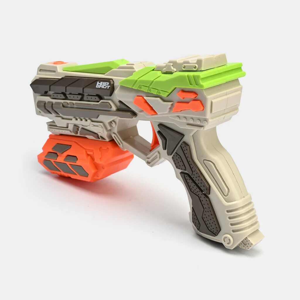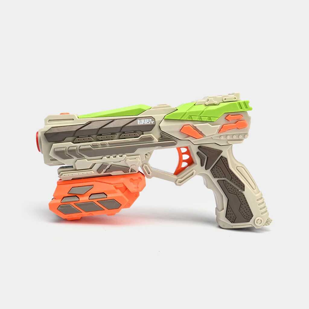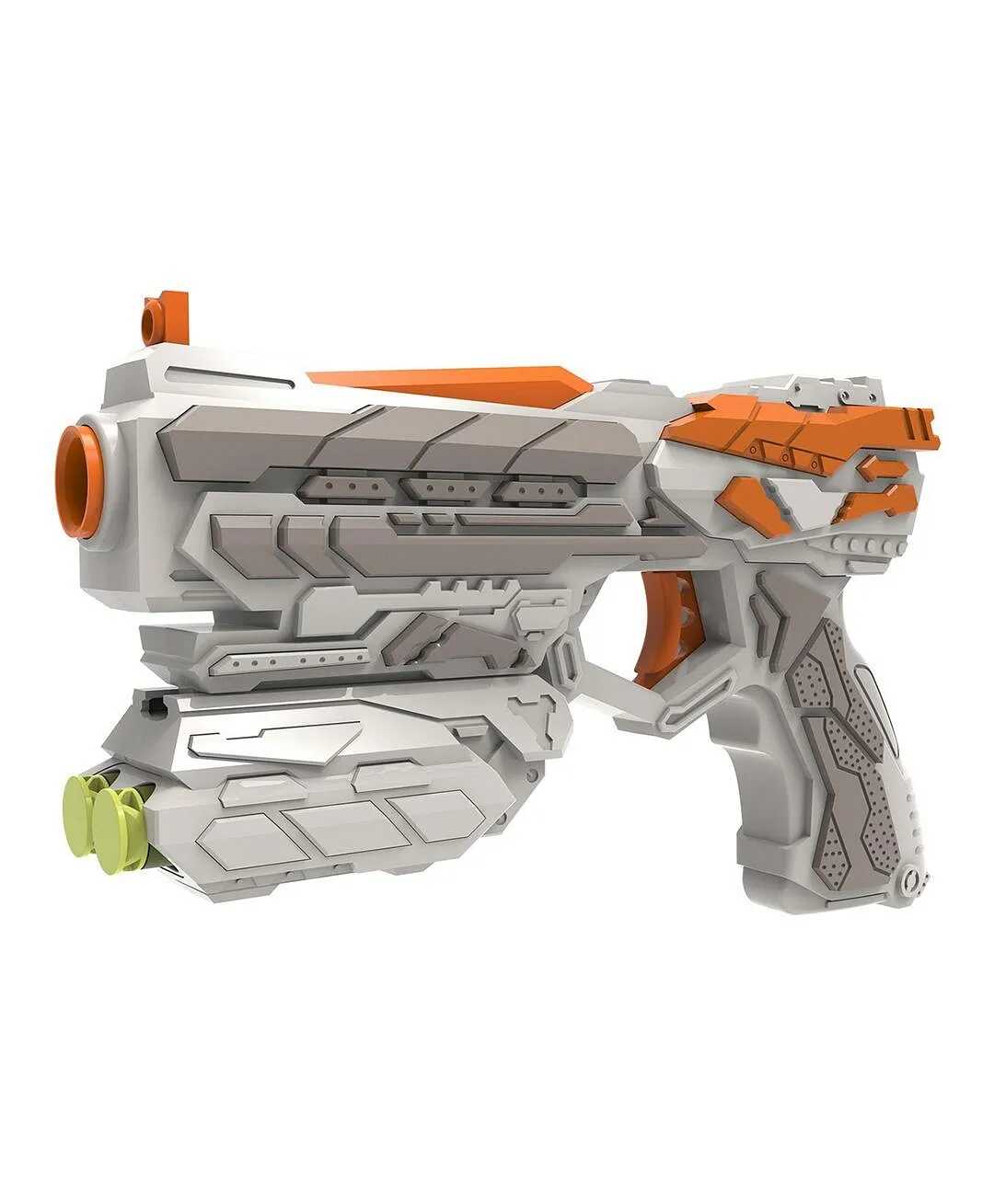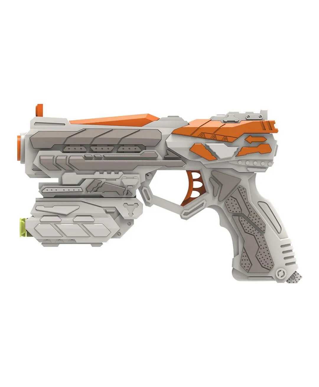 Ezzel a futurisztikus megjelenésű, zöldesszürke és élénk narancssárga színekben pompázó játékpisztollyal minden csata izgalmas kalanddá válik. A modern kialakítás és a kényelmes fogás garantálja, hogy a játékos mindig készen álljon az akcióra.
