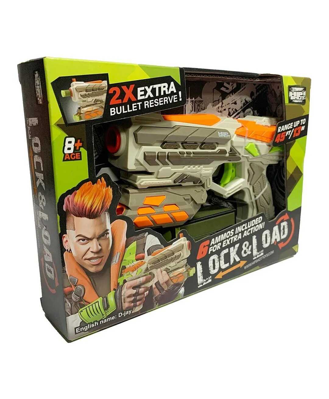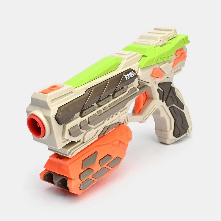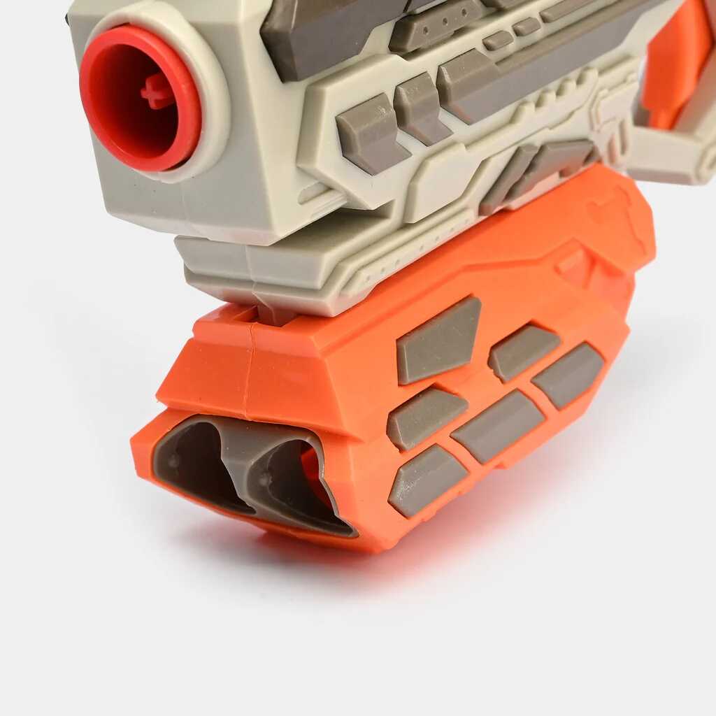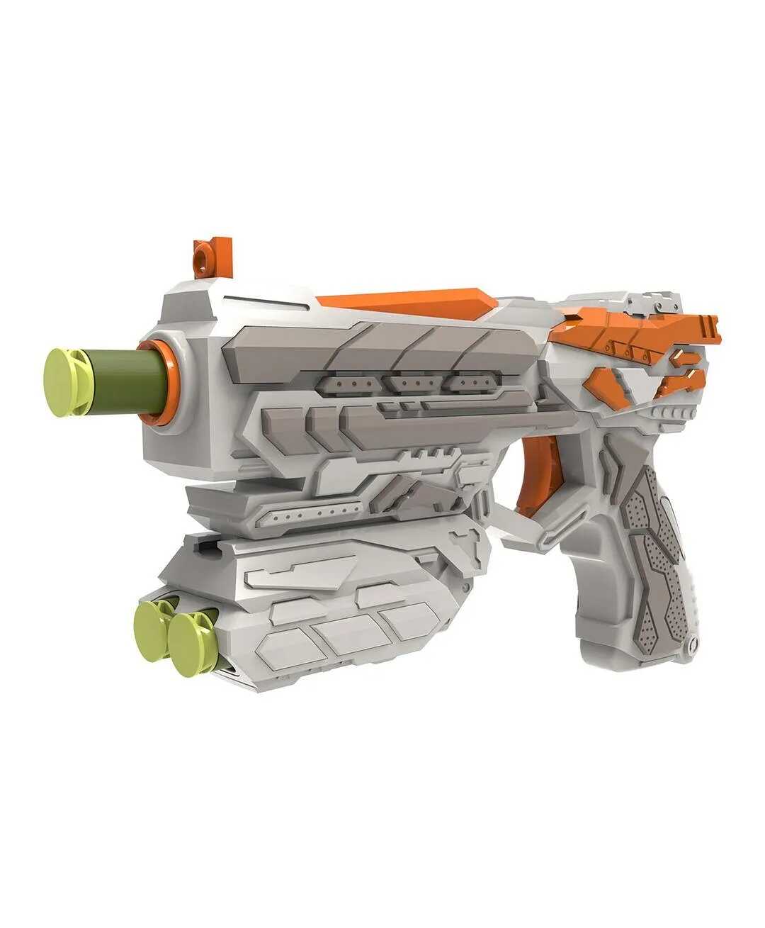Ezzel a futurisztikus megjelenésű, zöldesszürke és élénk narancssárga színekben pompázó játékpisztollyal minden csata izgalmas kalanddá válik. A modern kialakítás és a kényelmes fogás garantálja, hogy a játékos mindig készen álljon az akcióra.