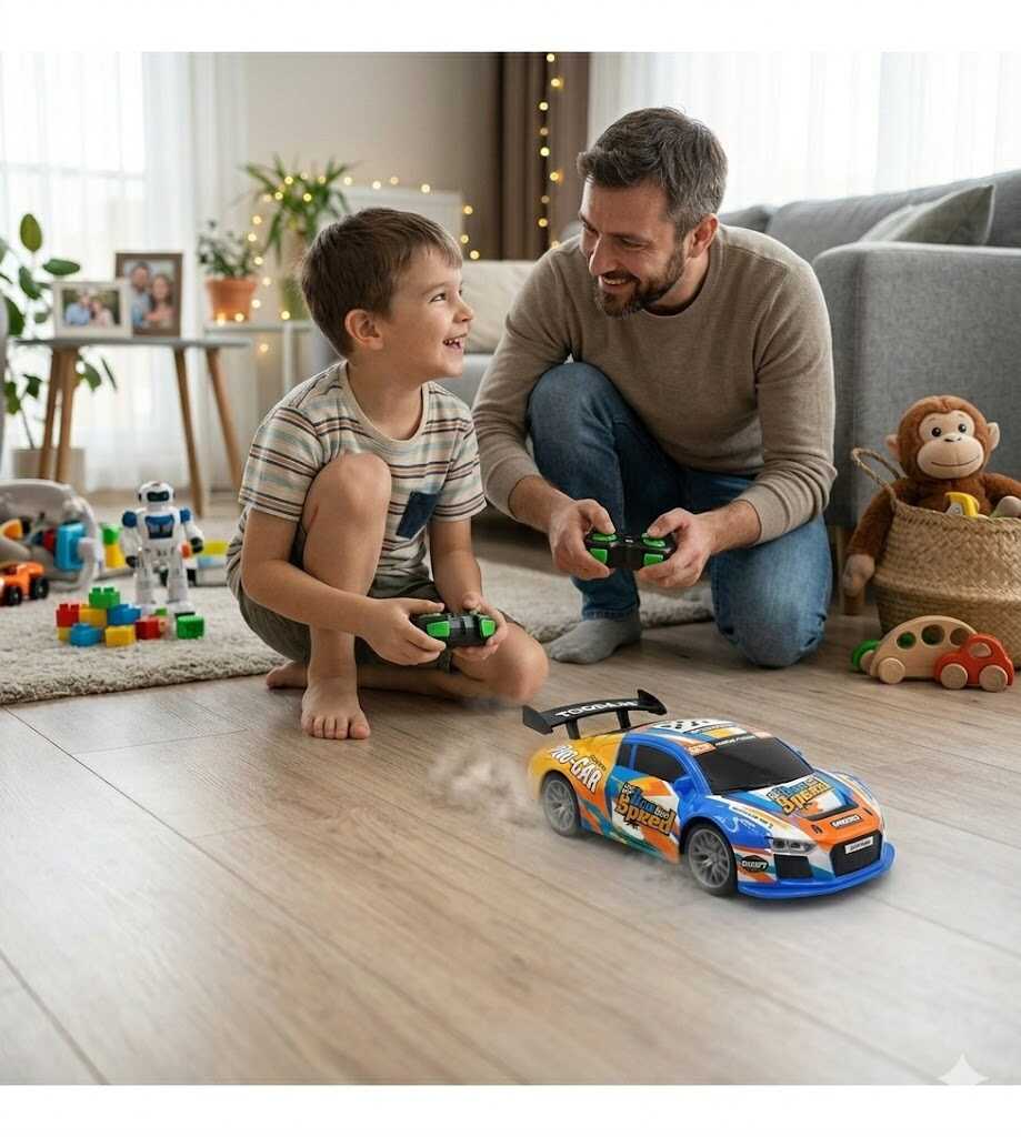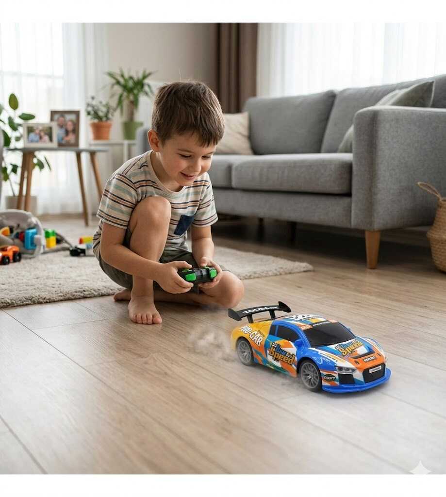 Az autóhoz egy kormánykerék formájú távirányító tartozik, amely kényelmes fogást biztosít és lehetővé teszi a pontos manőverezést. Legyen szó egyenes szakaszokról vagy éles kanyarokról, ez a modell fürgén reagál minden mozdulatra, így igazi versenyzőnek érezheted magad a volán mögött.