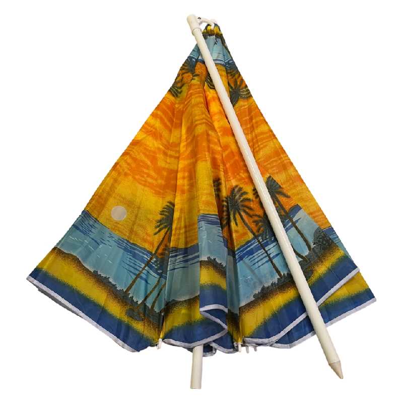 - Egzotikus trópusi mintás design: A napernyőt egy gyönyörű, naplementés tengerparti táj mintázat díszíti, pálmafákkal, kék tengerrel és sárgás-narancssárgás égbolttal. Ez az egyedi és vonzó minta azonnal nyaralási hangulatot teremt, és stílusos kiegészítője lesz bármely kültéri helyszínnek, magára vonzva a tekinteteket.