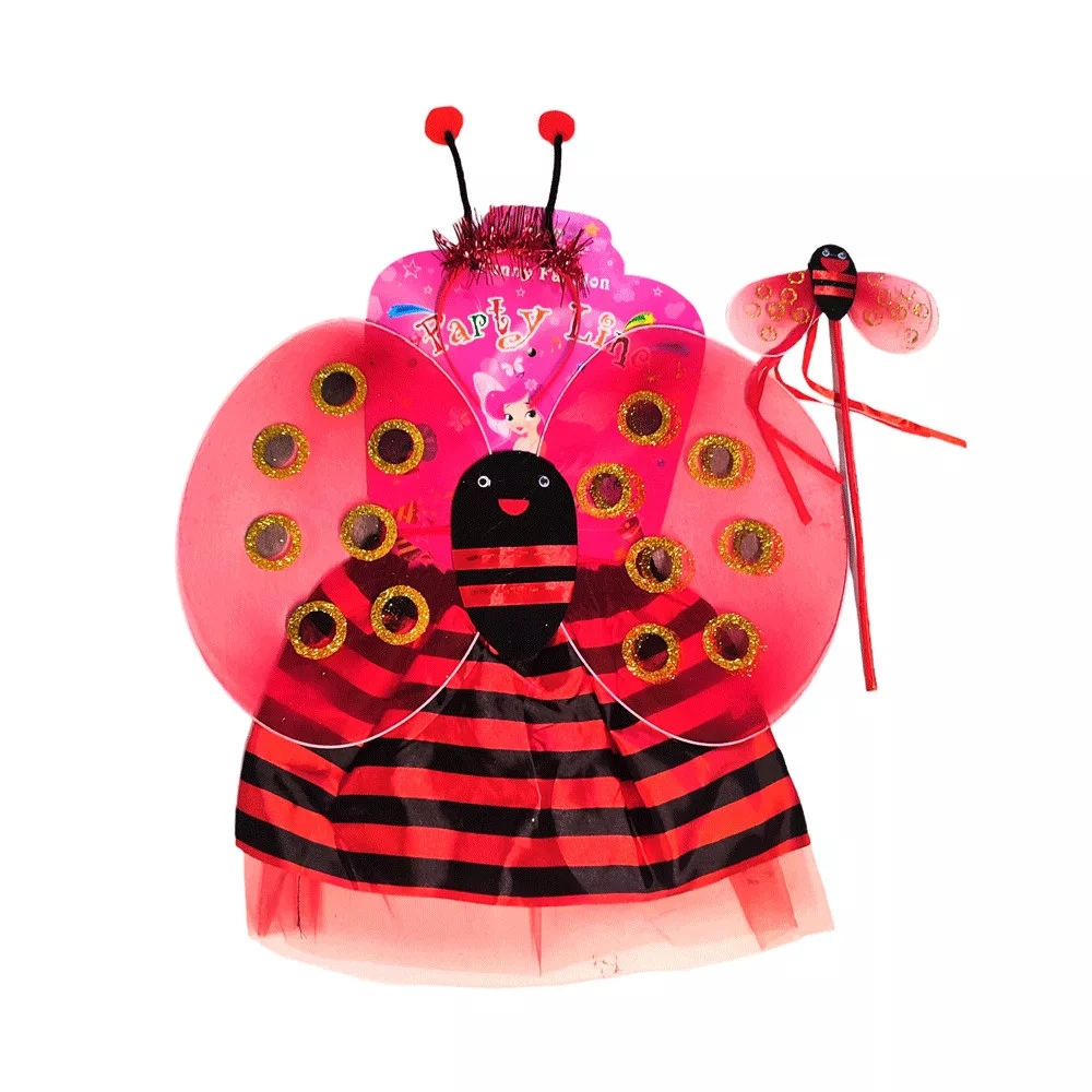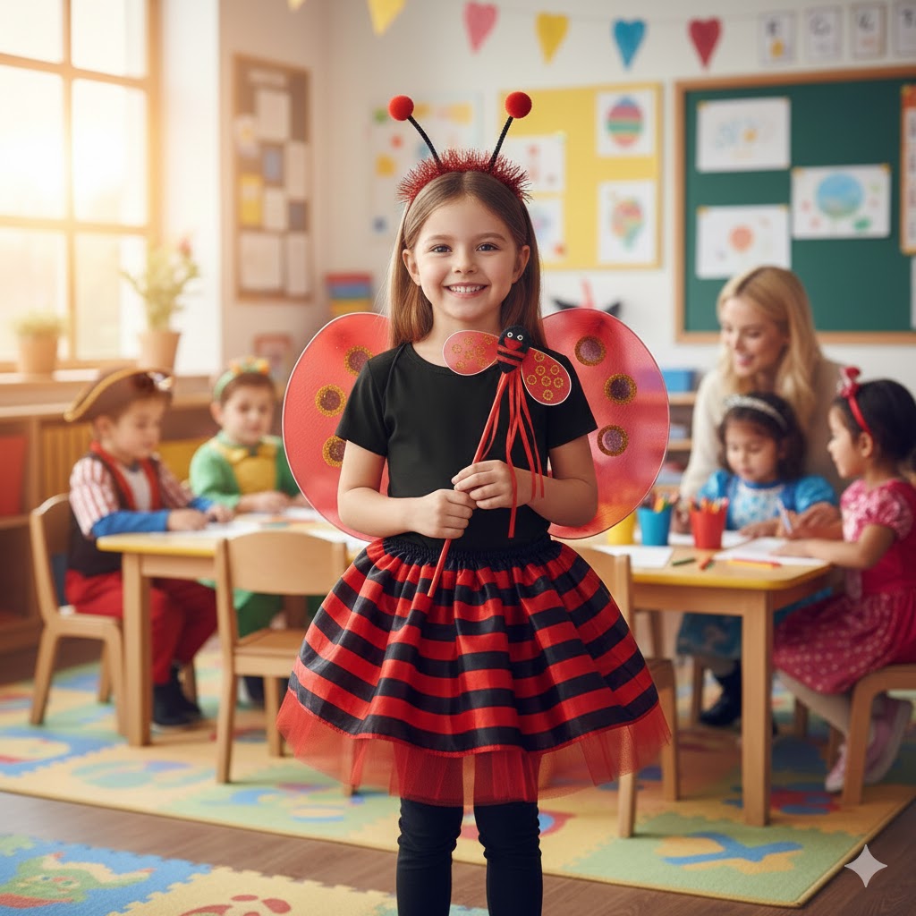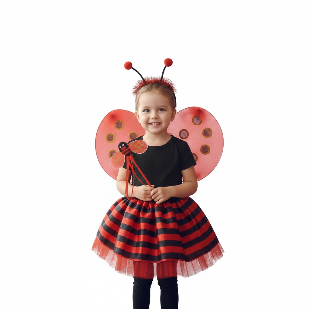 Nincs is bájosabb látvány egy pöttyös kis katicánál a farsangi bálon. Ez a 4 részes szett a tradicionális piros-fekete színeket ötvözi a játékos eleganciával. Tökéletes választás óvodai ünnepségekre, bölcsődei jelmezbálokra vagy akár otthoni szerepjátékhoz.