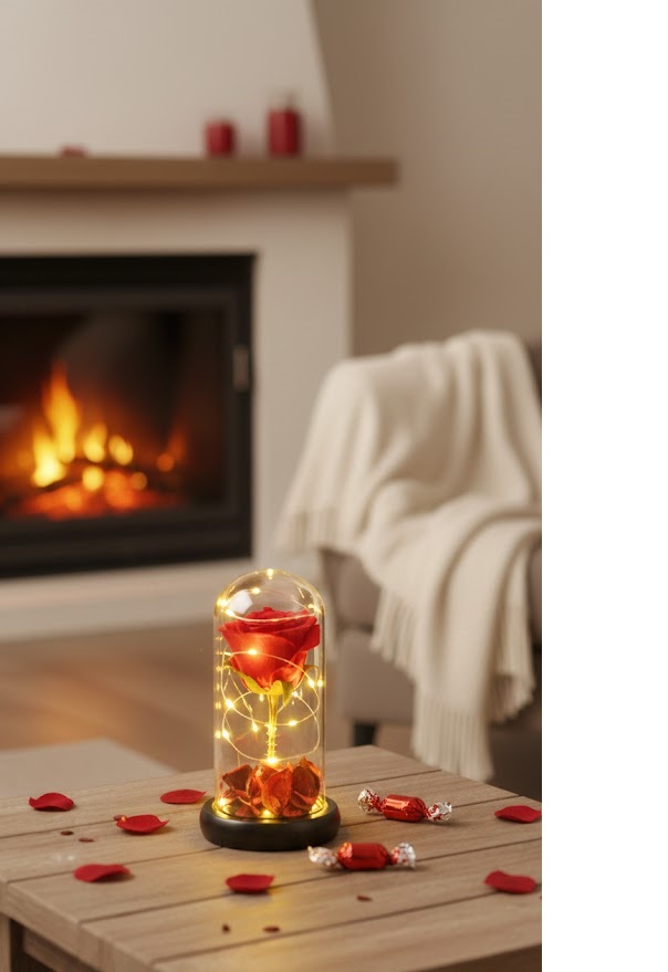 Bűvös LED világítás: A rózsa köré tekert apró fények tündöklő keretet adnak a virágnak, tökéletes hangulatvilágítást teremtve az éjszakában.