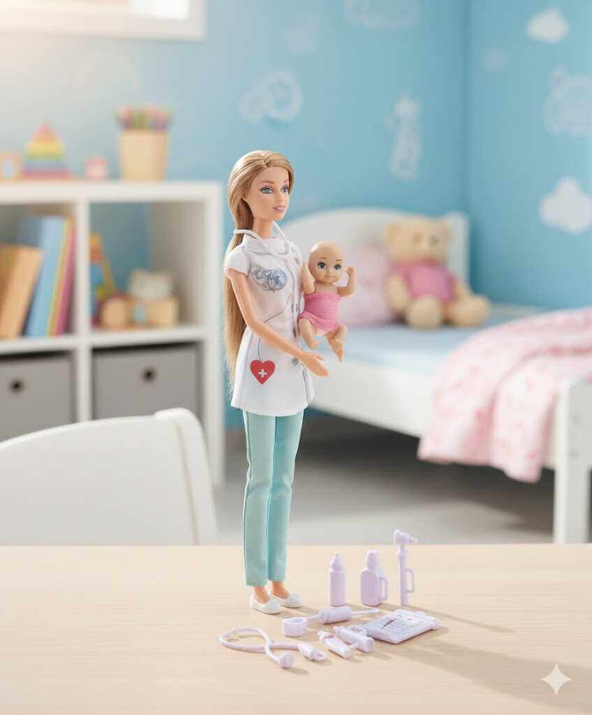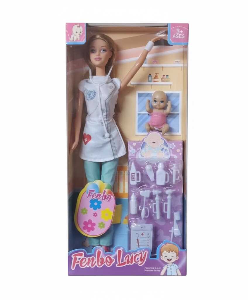 A szett főszereplője egy mosolygós doktornő baba, aki professzionális megjelenésével – fehér orvosi köpenyével és kék nadrágjával – azonnal bizalmat ébreszt a pácienseiben. A készlet egy apró újszülöttet is tartalmaz, akiről a doktornőnek kell gondoskodnia a mindennapi vizitek során.