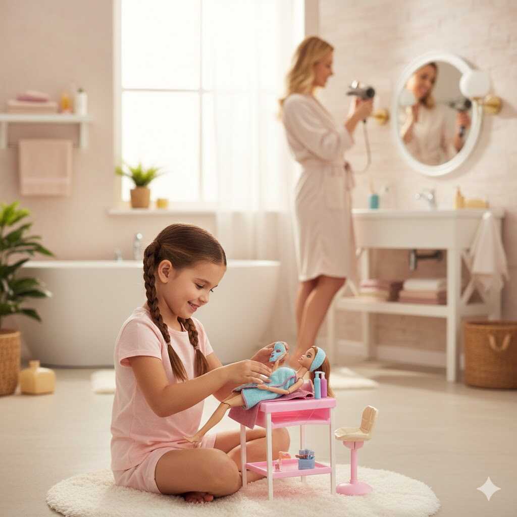 Részletgazdag kellékek: A polcokon elhelyezhető szépítőszerek és a kiegészítő kiskutya figura még élethűbbé teszik a szerepjátékot.